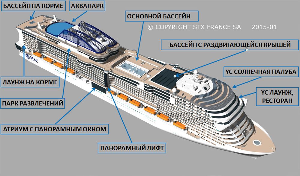 Учитывая пожелания своих пассажиров, компания вводит на этом принципиально новом судне новые категории кают. Так, на лайнере появятся каюты Family и Super Family, а также каюты-дуплекс. А еще здесь будет более просторный MSC Yacht Club – оазис роскоши на престижных верхних палубах в носовой части лайнера, в котором есть собственный солярий, салон и ресторан. На борту будет все необходимое для идеального круизного путешествия в любое время года и на любом направлении, в том числе разнообразные рестораны, обширная развлекательная программа, эффектные панорамные помещения, просторный театр, а также великолепный парк развлечений, соединенный с открытым аквапарком, и расположенный на трех палубах закрытый променад.