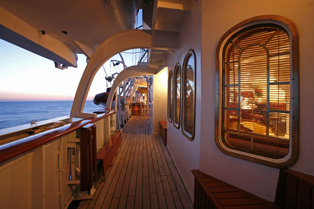 У "Royal Clipper" уникальная палуба.Она очень просторная и невероятно красивая. Здесь можно увидеть колокол, канаты, якоря, лебедки. Все это создает атмосферу приключений! На высоте 18 метров над палубой, расположена смотровая площадка, откуда открывается захватывающий вид! На этом судне можно полюбоваться не только морем, но и его подводным миром. Здесь есть клуб "Капитан Немо", где установлены иллюминаторы с подсветкой. Здесь можно понаблюдать за тем, что происходит под водой.