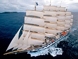 "Royal Clipper" - самое большое и быстроходное парусное судно в мире. Это судно было построено в 2000 году по примеру прекрасного предшественника - парусника "Preussen", который был знаменит в начале 20-го века. "Royal Clipper" грандиозное судно с 5-тью мачтами и оно может вместить 227 пассажиров на борту. Это судно идет на 42 парусах и при этом развивает скорость до 20 узлов! Такую же скорость развивают огромные круизные лайнеры. Сам парусник словно из книг, не хватает только алых парусов! Экипаж судна международный: из Европы, Индии, Филипинн. При этом, на 200 человек пассажиров приходится более 100 человек экипажа, что гарантирует высокий уровень сервиса.