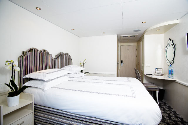 В каждой каюте: двуспальная кровать (за исключением кают, расположенных на нижней палубе), душ, туалет, кондиционер, шкаф, телевизор, фен, сейф, радиоточка, электрическая розетка 220 В, внутренняя телефонная связь, ROOM-сервис. Каюты на шлюпочной и средней палубах с индивидуальными балконами. (за исключением кают № 338 и 341)