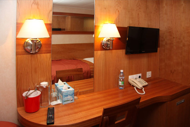 Каюты. Для размещения туристов предусмотрены: каюта класса «Люкс», каюты класса «Полулюкс А» с балконом, каюты класса «Полулюкс Б» с балконом, каюты класса «Полулюкс Б» без балкона, двухместные одноярусные каюты без балкона. Во всех каютах : шкаф для одежды, телевизор (спутниковое телевидение), сейф, холодильник, фен, радио, телефон, душ, санузел, обзорное окно или балкон, электророзетка 220 V.