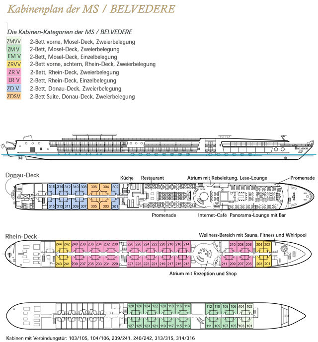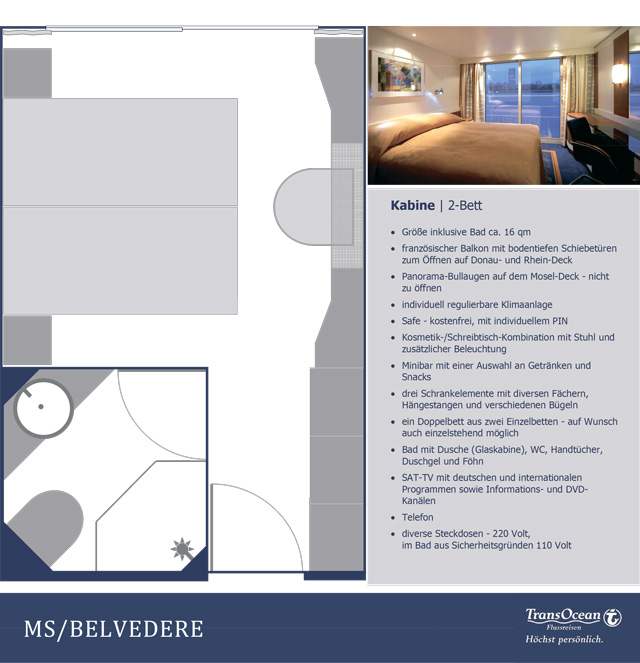 Belvedere – самый новый теплоход во флоте круизной компании Transocean Tours. Его устройство и дизайн направлены на то, чтобы сделать Ваш круиз по Европе наиболее зрелищным и запоминающимся. Просторные каюты, панорамное остекление, французские балконы… Даже кровати в каютах установлены таким образом, чтобы обеспечить прямой обзор на проходящие за бортом красоты.